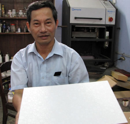 TS Trương Văn Chương và tấm gạch men đã sơn Nano TiO2-Ag hoàn toàn khô ráo và không bị bám nước.