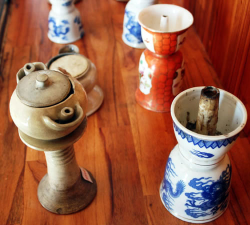 | Bộ sưu tập các loại đèn cổ dùng dầu phụng/ mỡ động vật được trưng bày tại Bảo tàng Điện Bàn trong khuôn khổ các hoạt động của Festival Di sản Quảng Nam lần thứ V-2013. |