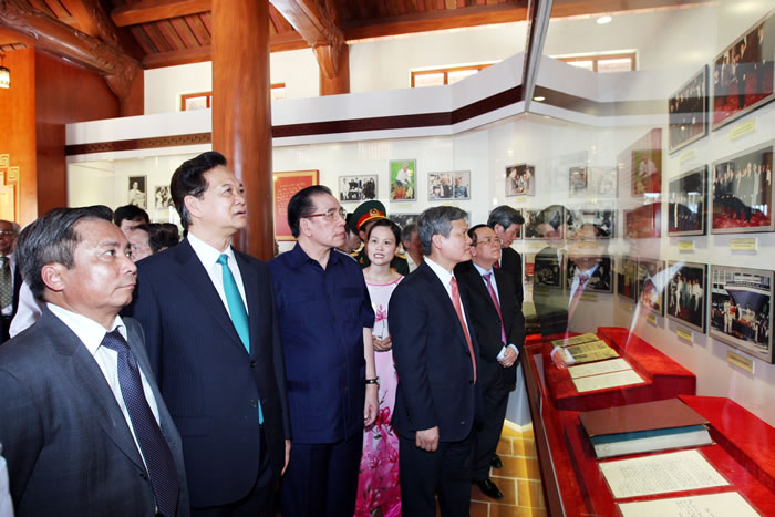 | Thủ tướng Nguyễn Tấn Dũng và các đại biểu xem một số hình ảnh và hiện vật về Tổng Bí thư Nguyễn Văn Linh tại Khu lưu niệm ở quê nhà. |