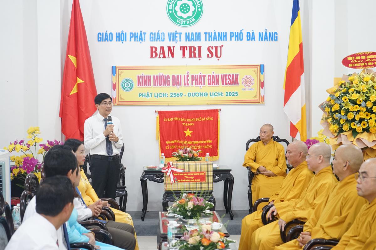 Thay mặt lãnh đạo TP, Trưởng Ban Tuyên giáo và Dân vận Thành ủy Trần Thắng Lợi gửi lời chúc mừng Đại lễ Phật đản an vui, viên mãn đến chư tôn đức, tăng ni, Phật tử toàn thành phố. Đồng thời biểu dương và ghi nhận Phật giáo Đà Nẵng nhiều năm qua đã đóng góp tích cực trong phát triển kinh tế – xã hội, gắn bó với các phong trào thi đua yêu nước, công tác an sinh xã hội, nhất là trong giai đoạn thành phố chịu ảnh hưởng bởi thiên tai, dịch bệnh. “Lễ Phật đản năm nay diễn ra trong không khí cả nước kỷ niệm 50 năm Ngày Giải phóng miền Nam, là dịp để chúng ta khơi dậy tinh thần yêu nước, hòa hợp dân tộc, đoàn kết xây dựng thành phố phát triển bền vững", Trưởng Ban Tuyên giáo và Dân vận Thành ủy Đà Nẵng nói.
