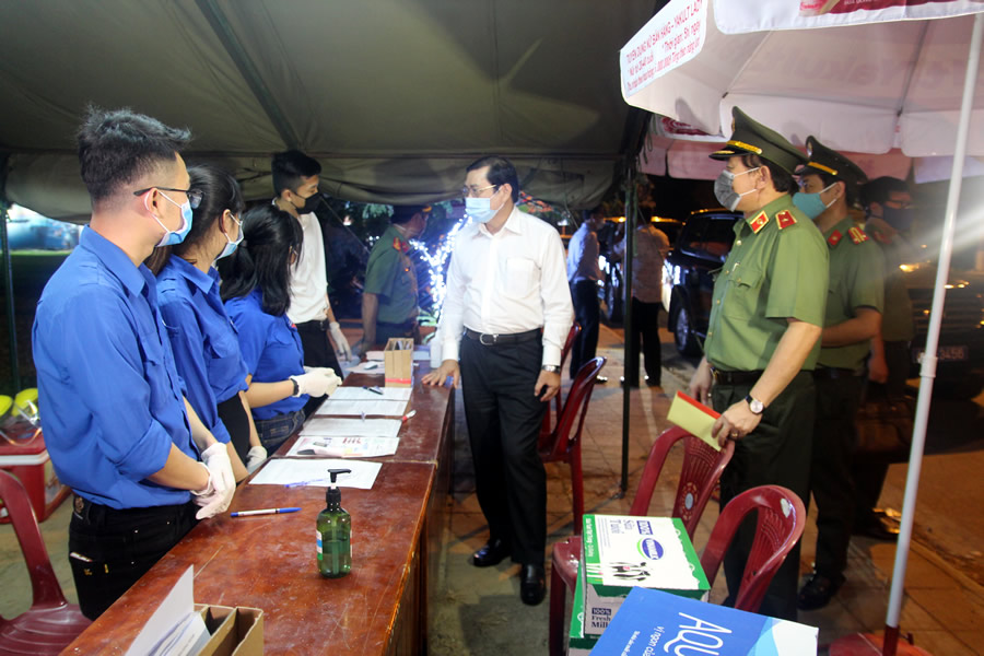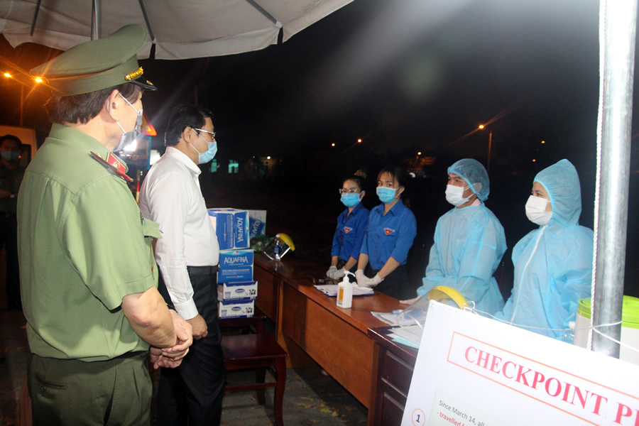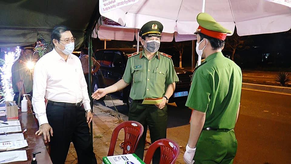 Chủ tịch UBND TP Đà Nẵng Huỳnh Đức Thơ và Giám đốc CATP Đà Nẵng Vũ Xuân Viên thăm chốt kiểm dịch tại cửa ô Hòa Phước (H. Hòa Vang, Đà Nẵng) |