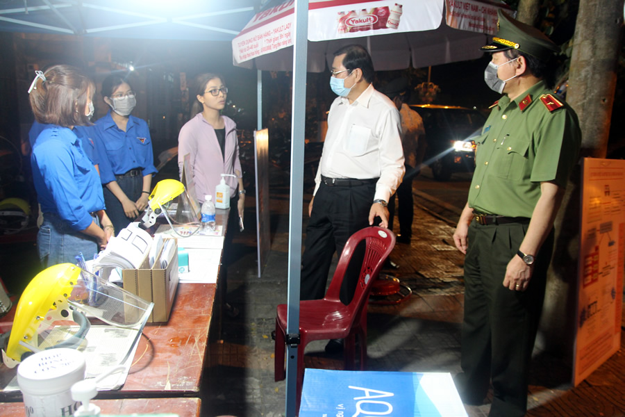 Thiếu tướng Vũ Xuân Viên và Chủ tịch Huỳnh Đức Thơ thăm thăm chốt kiểm dịch trên đường Trần Đại Nghĩa (Q. Ngũ Hành Sơn, Đà Nẵng). |