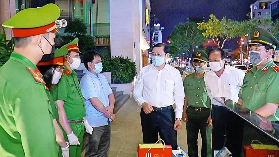 Chủ tịch UBND TP Huỳnh Đức Thơ và Giám đốc CATP Vũ Xuân Viên đến thăm cán bộ y tế, công an chốt chặn tại khách sạn Vanda. |