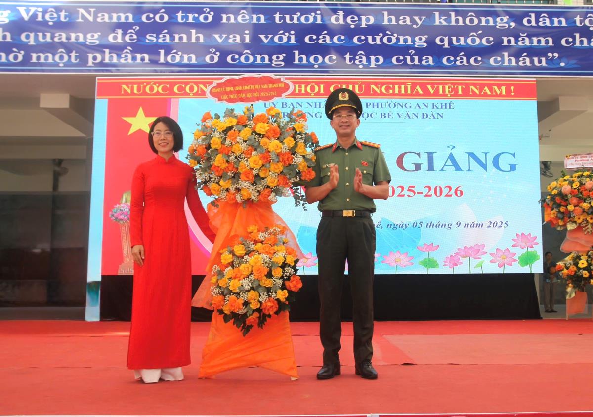Đại tá Nguyễn Đại Đồng- Phó Giám đốc Công an TP Đà Nẵng và ông Nguyễn Lê Mậu Cường- Bí thư Đảng ủy phường An Khê dự lễ khai giảng năm học mới tại Trường Tiểu học Bế Văn Đàn.