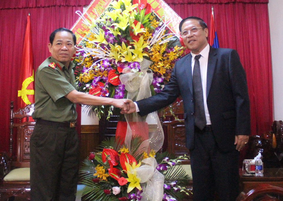 Đại tá Trần Đình Liên tặng hoa chúc mừng ông Viengxay Phommachanh - Lãnh sự quán Lào tại Đà Nẵng nhân dịp Tết cổ truyền “Bunpimay Lào 2562”. |