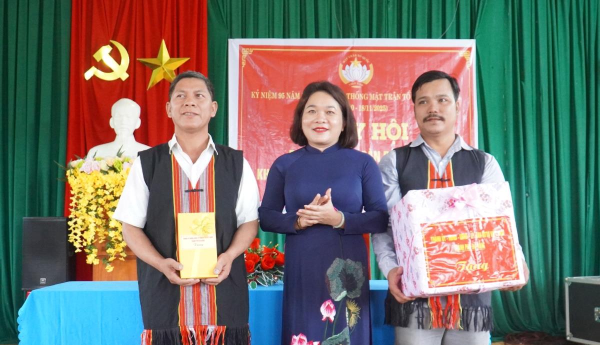 Dịp này, Trưởng Ban Tuyên giáo và Dân vận Thành ủy Huỳnh Thị Thùy Dung đã trao quà mừng Ngày hội Đại đoàn kết cho khu dân cư thôn Hạ Sơn; trao 20 suất quà tặng cho hộ nghèo và hộ dân bị ảnh hưởng bởi thiên tai.