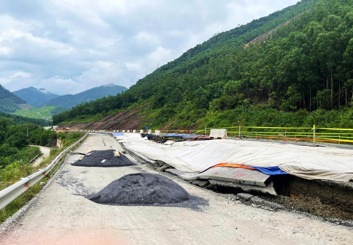 Riêng tại đoạn từ Km 41+450 đến Km 42+800 bị sạt lở nghiêm trọng với tổng khối lượng đất, đá sạt lở khoảng 35.000 - 42.000m³, đang tổ chức thu dọn. Tại đoạn từ Km50+700 - Km50+800 đi qua khu vực địa hình dốc, mái taluy âm cao, xuất hiện vết nứt mặt đường dài khoảng 80m, rộng từ 5 - 10cm, mặt cắt có dấu hiệu dịch chuyển nền đường và sụt lún cục bộ. Đáng chú ý, tại khu vực nút giao N1 (Khe Tre) giữa cao tốc La Sơn - Hòa Liên và QL14B có nền đường và kết cấu rãnh thoát nước bị phá vỡ, có nguy cơ tiếp tục trượt sạt nếu trời tiếp tục mưa. Hiện các đơn vị thi công tập trung lực lượng, máy đào, xe ben, xe vận tải… tiếp tục thi công 24/24 giờ để hốt dọn đất, đá sạt lở, đồng thời khoan neo và phun bê-tông tạm gia cố mái taluy dương, taluy âm tại các vị trí sạt lở với quyết tâm hoàn thành khắc phục bước 1 trên toàn tuyến cao tốc La Sơn -Túy Loan trước ngày 2-11.
