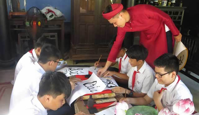 Học sinh tham quan nhà lưu niệm Chủ tịch Hồ Chí Minh ở 112 đường Mai Thúc Loan. |