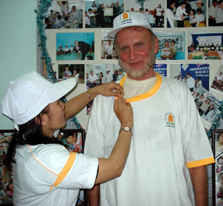 tặng áo và logo danh dự của Hội cho ông Larry Vetter. Ảnh: P.V