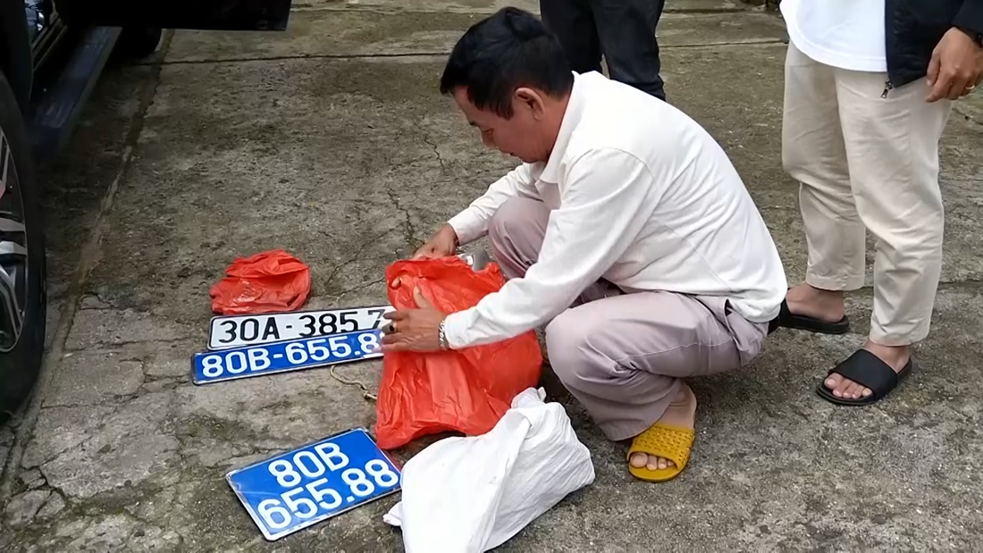 Nhiều biển số xe ô-tô giả trong túi vải của Nguyễn Văn Hòa. |
