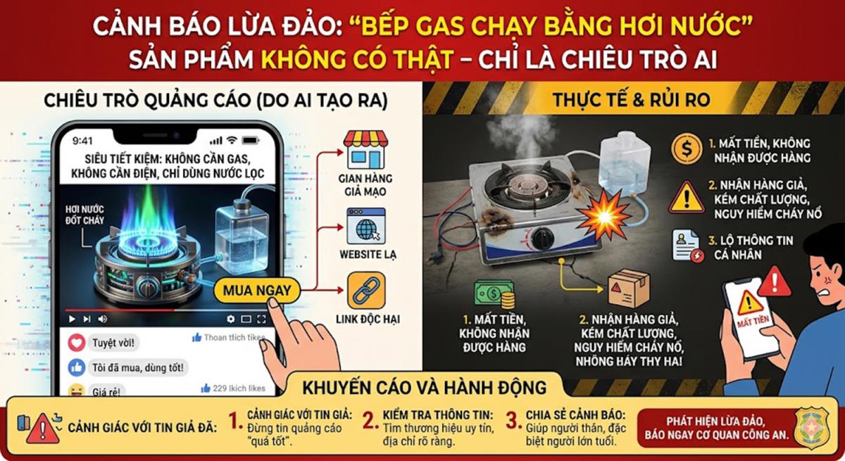 Tuy nhiên, qua xác minh của các cơ quan chức năng thì đây là thủ đoạn quảng cáo lừa để đánh lừa người dùng, phần lớn các video quảng cáo được tạo ra hoặc cắt ghép bằng AI. Hình ảnh ngọn lửa, thao tác đổ nước và ngay cả giọng nói thuyết minh đều là sản phẩm của công nghệ, trông rất thật nhưng hoàn toàn là ảo. Bên cạnh đó, các đối tượng còn giả tạo bằng chứng bằng cách dàn dựng cảnh quay bằng cách giấu bình gas hoặc dây dẫn gas thật bên dưới chiếc bếp được thiết kế để chứa nước, tạo cảm giác như nước đang "sủi bọt" và tạo ra lửa. Tiếp đó, trên các tài khoản mạng xã hội đăng video quảng cáo “bếp gas hơi nước thế hệ mới” này, các đối tượng còn sử dụng các tài khoản giả vào bình luận khen ngợi, khẳng định đã mua và sử dụng tốt… nhằm tạo hiệu ứng đám đông và tạo lòng tin giả cho người xem.