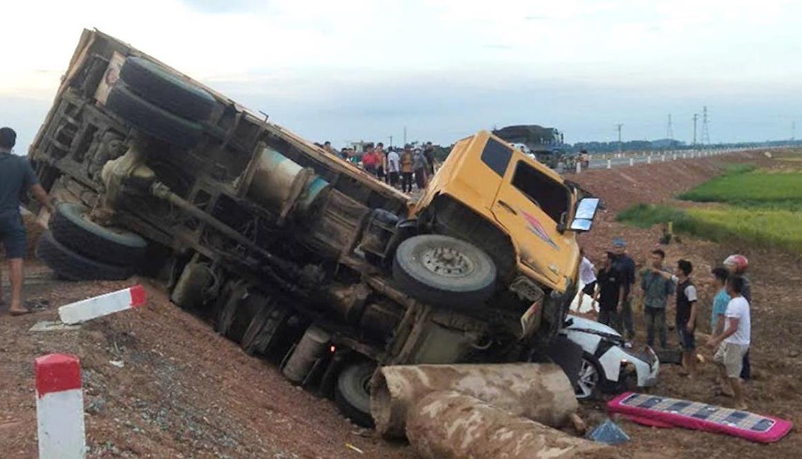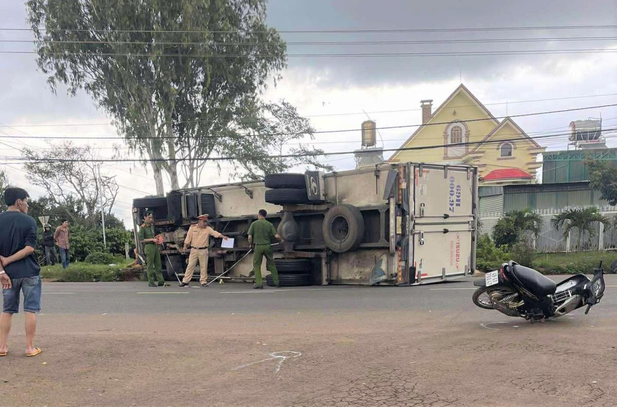Lúc 12 giờ 50 ngày 23-5, trên Quốc lộ 20, đoạn qua xã Hà Lâm (huyện Đạ Huoai) xảy ra vụ tai nạn lật xe container.
