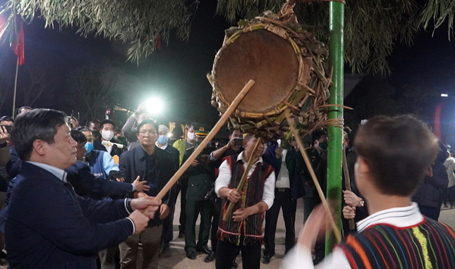 Lãnh đạo tỉnh Quảng Bình tham gia lễ hội Đập trống cùng dân làng.