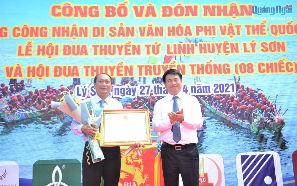 Phó Bí thư Thường trực Tỉnh ủy Quảng Ngãi Đặng Ngọc Huy trao Bằng công nhận Di sản văn hóa phi vật thể quốc gia Lễ hội đua thuyền Tứ linh cho lãnh đạo H. Lý Sơn. |