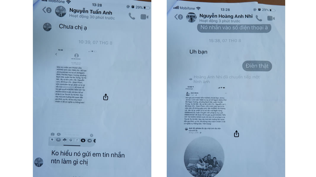 Bà Nguyễn Thúy Lan (1983, trú Bùi Ngọc Hương, P. Bạch Mai, Q. Hai Bà Trưng, TP Hà Nội) gửi đơn đến Báo Công an TP Đà Nẵng tố cáo một số người lợi dụng mạng xã hội để đòi nợ. Trong đơn ghi ngày 11- 8-2020, bà Lan trình bày: "Nhiều tháng qua, các tài khoản facebook mang tên Nguyễn Cảnh Tài, Anh Minh, Anh Susu, Nguyễn Nhật Tuấn mang danh nghĩa là nhân viên Văn phòng Luật sư Phú Vinh hoặc tài khoản zalo... nhắn tin, gọi điện với những lời lẽ đe dọa, thách thức, xúc phạm danh dự và nhân phẩm của cá nhân tôi. Cụ thể, họ cho rằng cá nhân tôi cùng với ông Phạm Văn Hoàng (chồng cũ đã ly hôn) có hành vi lừa đảo chiếm đoạt tài sản... Gần đây, người sử dụng tài khoản email có tên Trần Đăng Thắng tự xưng là nhân viên Cty Luật LDL có địa chỉ tại Đà Nẵng gửi mail, có nội dung cho rằng tôi có liên quan đến khoản nợ tín dụng của ông Hoàng...