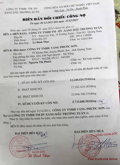 Ông Thục cho biết, ngày 1-1-2011, Cty của ông ký hợp đồng cung cấp xăng dầu cho Cty Khai thác vàng Bồng Miêu. Ngày 5-12-2013, khi đối chiếu công nợ, Cty Khai thác vàng Bồng Miêu nợ Cty ông Thục hơn 1,1 tỷ đồng. Tương tự, Cty Vàng Phước Sơn cũng nợ Cty ông Thục hơn 5,7 tỷ đồng. Mặc dù, Cty ông Thục đòi nhiều lần nhưng Tập đoàn Besra vẫn không chịu trả. Để có vốn cung cấp xăng dầu cho đối tác, Cty ông Thục phải vay ngân hàng. Hiện Besra không chịu trả nên tiền lãi ngân hàng mỗi tháng phía ông Thục phải nộp gần 60 triệu đồng.