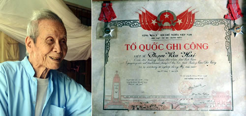 Ông Phạm Kiệu cười mãn nguyện và Bằng “Tổ quốc ghi công” của “liệt sĩ” Phạm Văn Hai. |