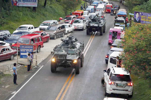 Xe tăng quân đội trên đường phố Marawi trong bối cảnh người dân tháo chạy khỏi thành phố này do lo ngại xung đột leo thang. Ảnh: AP |