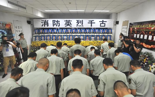 Lực lượng cứu hỏa tham dự một lễ tang các nhân viên thiệt mạng trong các vụ nổ. Ảnh: THX |