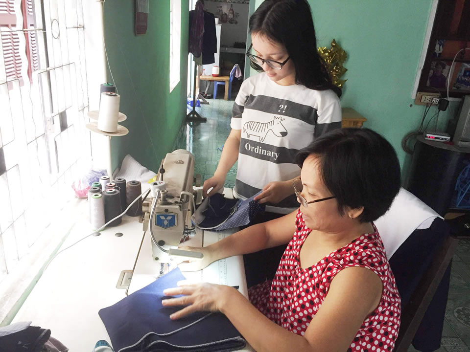 Hòa Nhi tranh thủ phụ mẹ may vá quần áo trước khi vào TP HCM nhập học. |