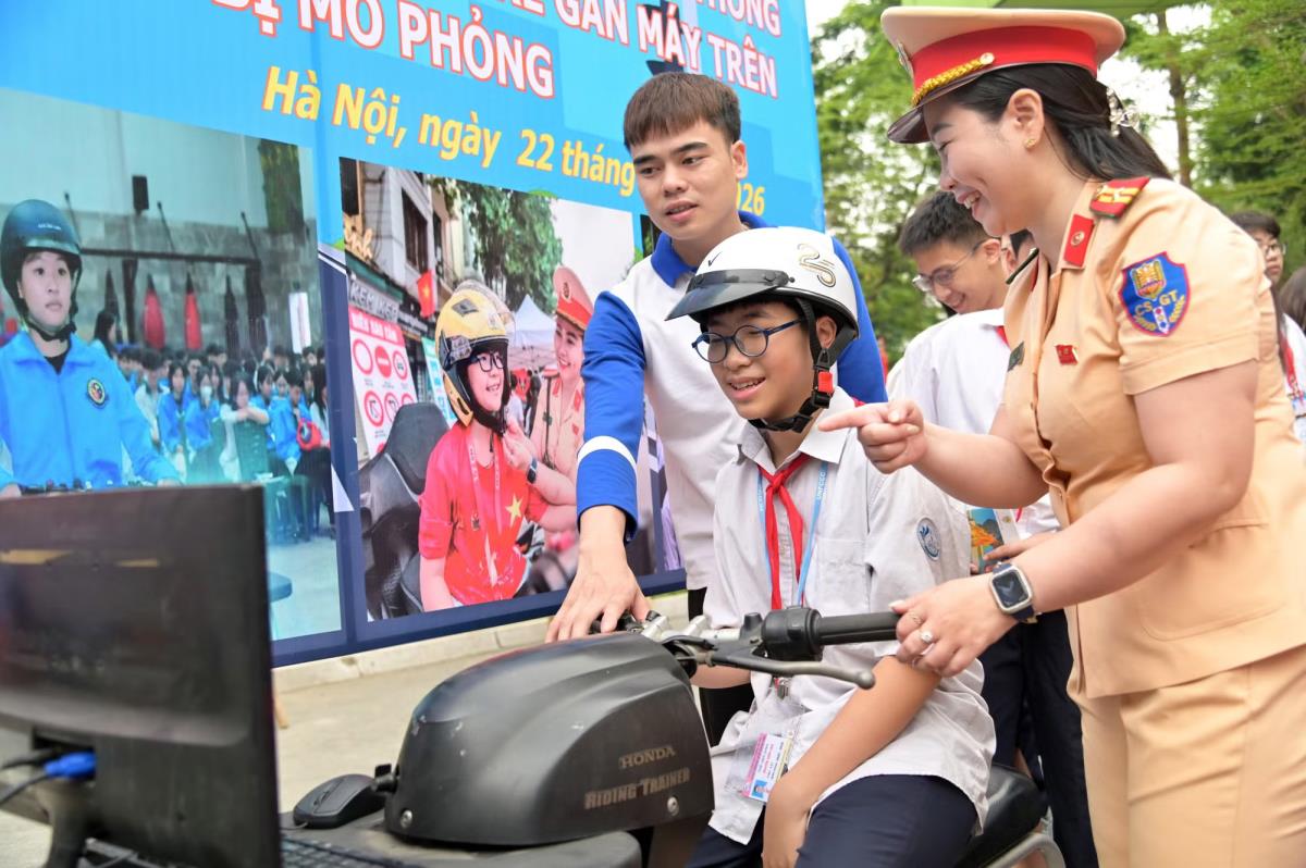 Ở trường Marie Curie Long Biên, diễn viên Trung Ruồi dẫn dắt những tràng cười không ngớt về các lỗi giao thông quen thuộc - không mũ bảo hiểm, vượt đèn đỏ, "kẹp ba" - nhưng đằng sau tiếng cười là những con số tai nạn khiến người ta chợt nín lặng.