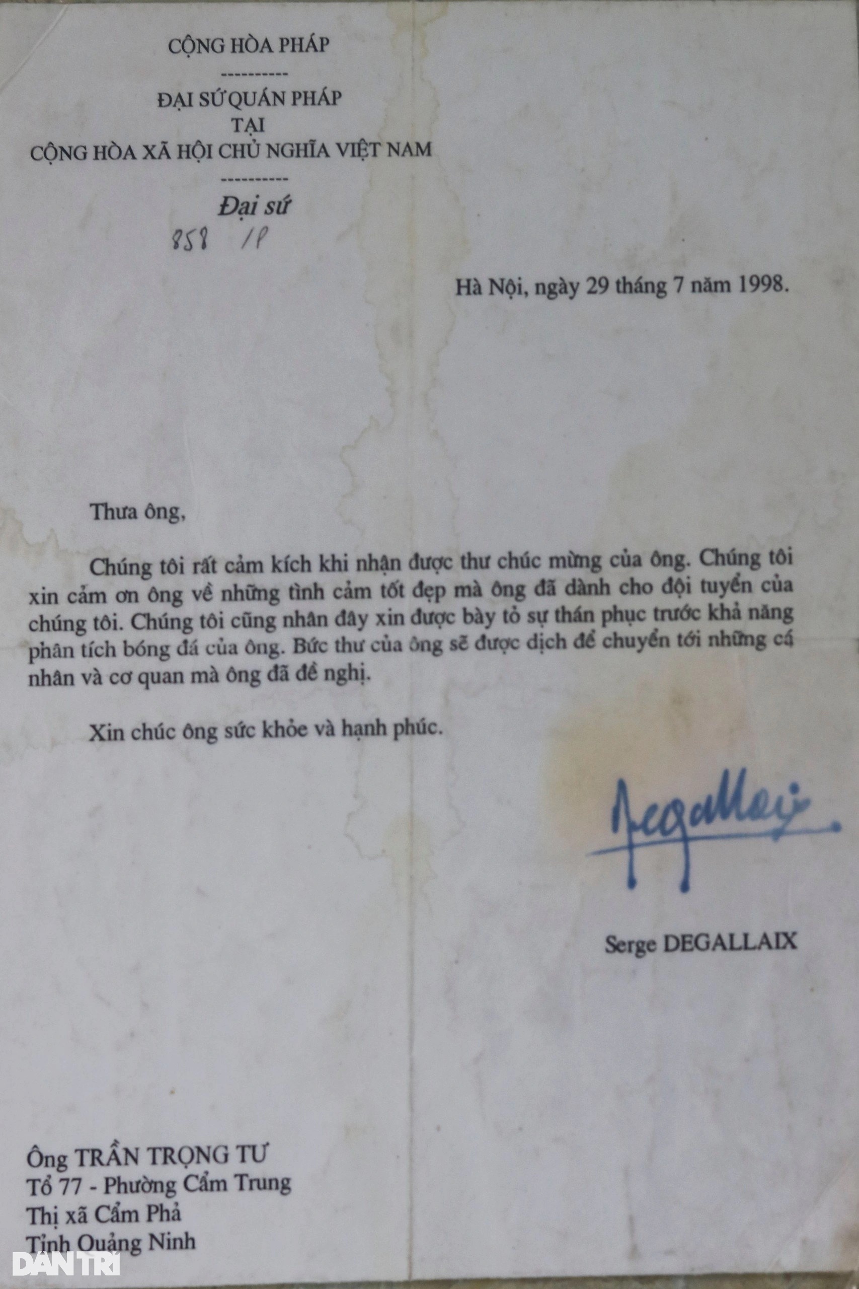 "Lúc đầu tôi định viết bằng tiếng Pháp nhưng sau tôi nghĩ là con cháu cụ Hồ, "ăn cơm tẻ, mặc áo sợi bông", mình phải nói tiếng cha mẹ đẻ mình. Đầu tiên là gửi cho Đại sứ quán Pháp, và gửi thẳng cho Tổng thống Pháp Jacques Chirac, Chủ tịch Liên đoàn Thể thao và đội tuyển bóng đá Pháp", ông Trần Trọng Tú nhớ lại