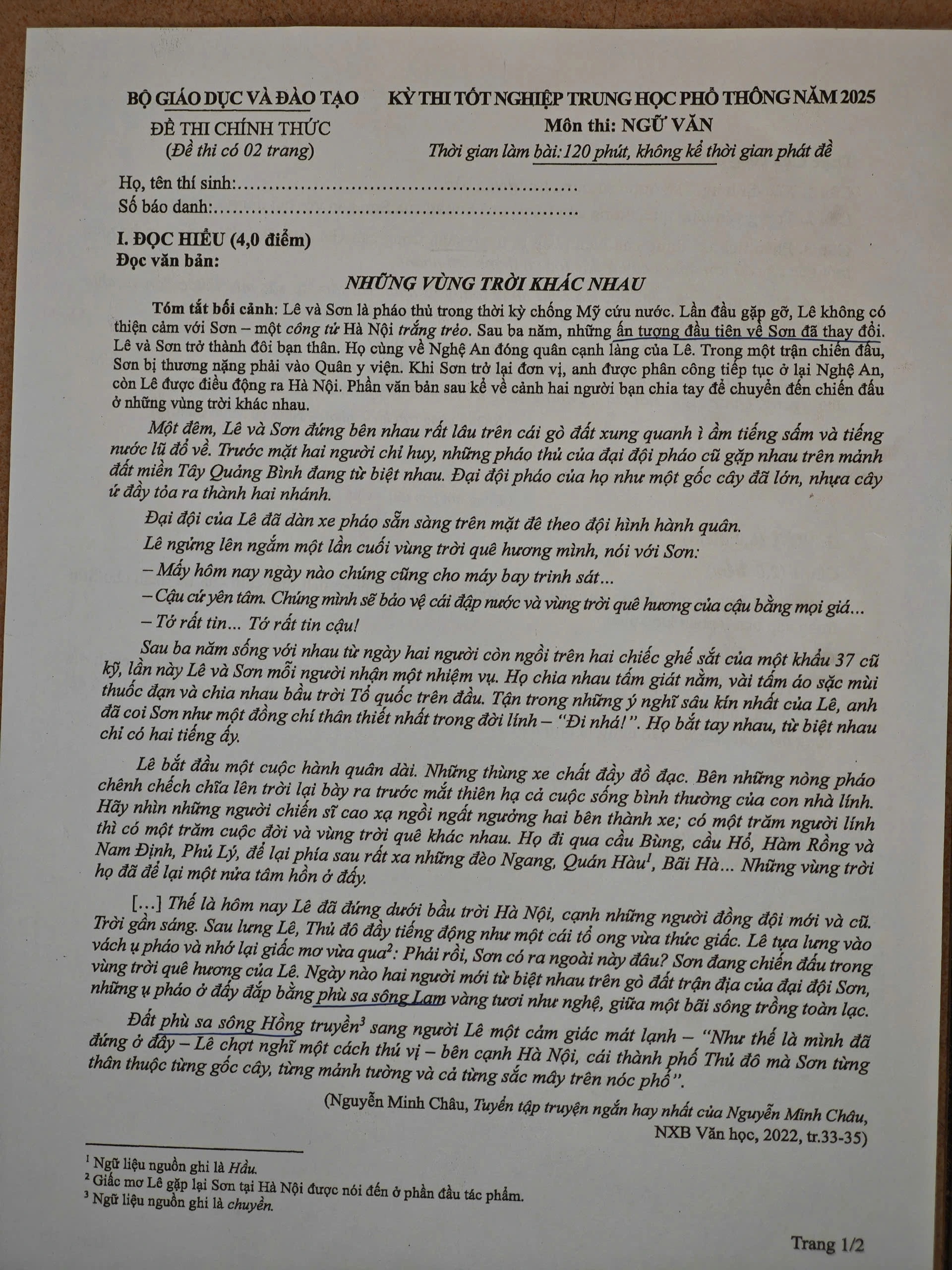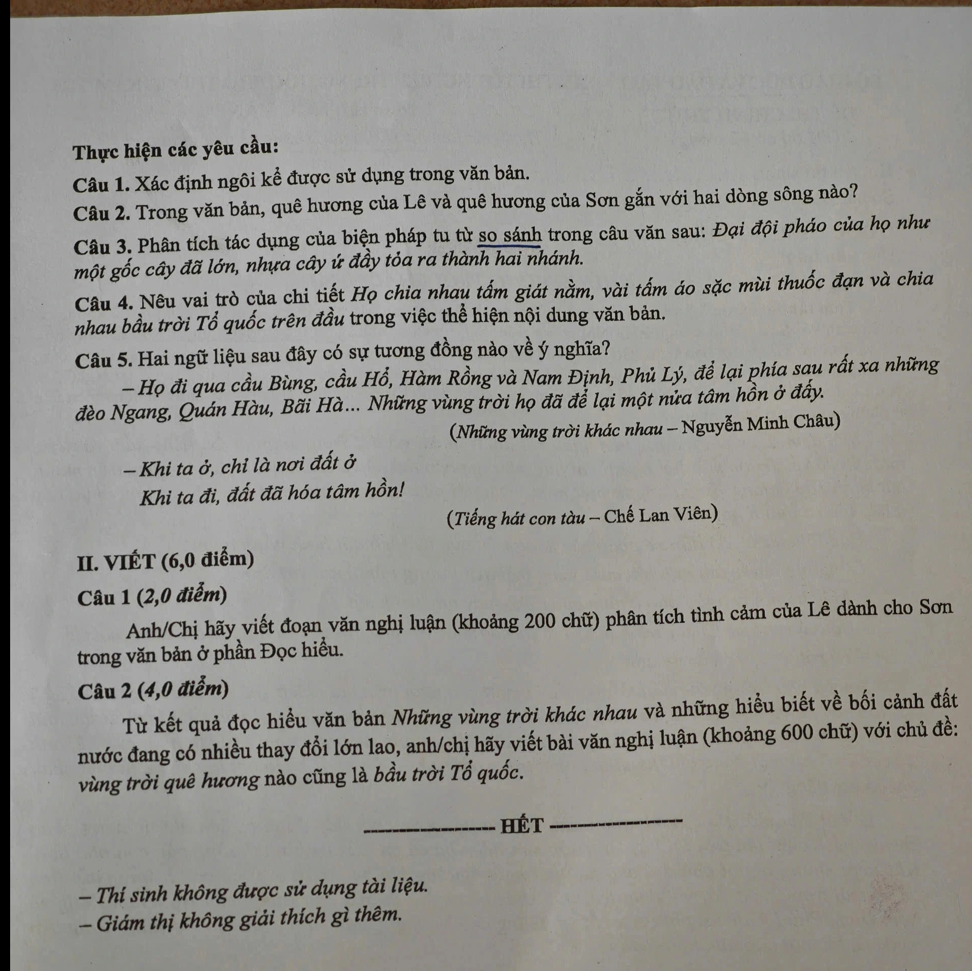 Câu 2. Trong văn bản, quê hương của Lê và quê hương của Sơn gắn với hai dòng sông nào?