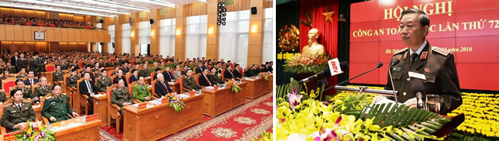 Hội nghị CA toàn quốc lần thứ 72 nhằm đánh giá kết quả các mặt công tác CA, kết quả phong trào thi đua “Vì an ninh Tổ quốc” của lực lượng CAND năm 2016, triển khai thực hiện các chủ trương, giải pháp, nhiệm vụ công tác CA năm 2017. Đồng chí Thượng tướng Tô Lâm- Ủy viên Bộ Chính trị, Bí thư Đảng ủy CAT.Ư, Bộ trưởng Bộ CA, chủ trì Hội nghị.
