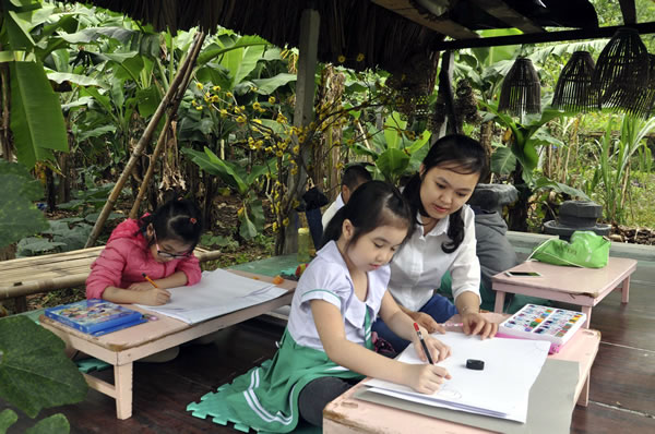 | Không gian lớp học không còn bó buộc trong 4 bức tường đã tạo sự hứng thú, đam mê học tập của học sinh. |