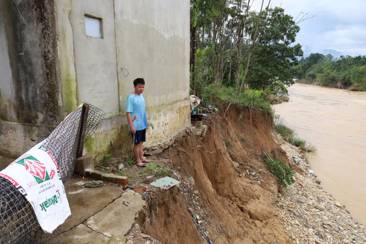Nằm sát mép sông Trường, căn nhà của bà Nguyễn Thị Bé (1973, thôn 4, xã Phước Hiệp) hiện chỉ cách dòng nước vài bước chân. Đợt lũ cuối tháng 10 vừa qua khiến nước dâng cao, chảy xiết khiến bà và gia đình nhiều đêm không ngủ được vì lo lắng. "Hiện nay nhà tôi sát bờ sông nên nơm nớp. Nhìn nước chảy xiết mà sợ lắm. Nếu không có biện pháp kịp thời thì nguy cơ mất nhà chỉ là sớm muộn", bà Bé chia sẻ.