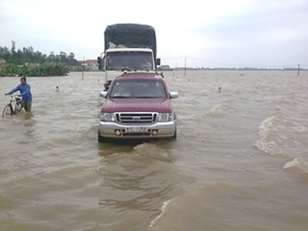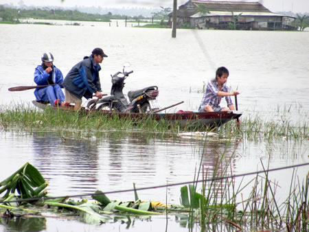Trên Tỉnh lộ 8 (TT-Huế), người và xe đều được di chuyển bằng ghe. |