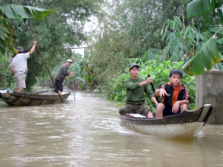 Ngay trong chiều 16-11, P.V Báo Công an TP Đà Nẵng đã có mặt ở tâm lũ H. Hương Trà, bắt đầu từ xã Hương Toàn kéo dài về các xã hạ du của sông Bồ. Từ QL1A theo tỉnh lộ 8, các phương tiện giao thông như: ô-tô, xe máy, xe đạp... đều bị tê liệt. Đường về với các xã hạ du của sông Bồ, ven phá Tam Giang bốn bề là nước lũ. Người dân, xe cộ muốn qua tuyến đường này chỉ đi lại bằng ghe.