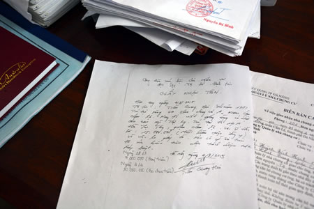 Tiếp tục, cán bộ Cty cũng theo dõi mọi hành tung của đối tượng lừa đảo từ việc nhận tiền ở đâu, làm giả hồ sơ thế nào. Theo đó, để thực hiện hành vi, các đối tượng đã “tia” những khu CC còn trống, mới bố trí ít người sau đó làm giả con dấu, chữ ký mà giám đốc Cty thường thể hiện ở tờ Biên bản cam kết với các hộ dân được bố trí để giao nhà cho người có nhu cầu mua đi làm thủ tục điện, nước rồi về ở. Sau khi có “Biên bản cam kết” giao nhà với đầy đủ chữ ký, con dấu giả và hợp đồng điện nước, người dân trình với Nhà trưởng (bảo vệ) vào ở. Chính sự tinh vi này, ngay cả Nhà trưởng cũng bị qua mặt, vì với chức năng nhà trưởng, hộ nào được bố trí CC, hễ có đủ hồ sơ là tiến hành cho người dân vào ở.