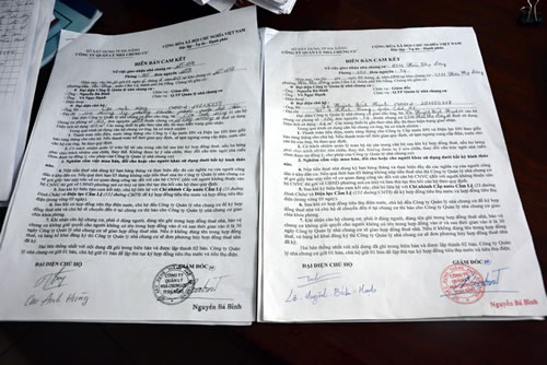 Sau khi nhận đủ số tiền trên, ngày 4-12-2014, ông Hai giao cho chị P. "Biên bản cam kết về việc giao nhận nhà tại khu A2 CC nam cầu Cẩm Lệ", đồng thời trao chìa khóa phòng 208 khu E (khóa còn niêm phong) cho chị P. Trong "Biên bản cam kết" mà ông Hai giao cho chị P. có dấu đỏ của Cty Quản lý NCC TP Đà Nẵng và chữ ký của Giám đốc là ông Nguyễn Bá Bình. Kể từ đó, chị P. vào ở CC tới ngày 17-4-2015 thì bị yêu cầu nộp lại các giấy tờ liên quan.