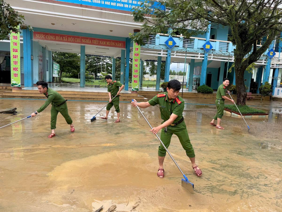 Sáng 30-10, nước cũng bắt lũ đầu rút tại một số nơi trên địa bàn tỉnh Quảng Ngãi, lộ ra một lượng lớn bùn đất phủ kín khu dân cư và trường học, khiến học sinh chưa thể trở lại lớp. Trước tình hình đó, Trung đoàn Cảnh sát cơ động Nam Trung Bộ đã huy động 100 cán bộ, chiến sĩ đến các trường học, nhà dân để hỗ trợ dọn dẹp, khắc phục hậu quả sau mưa lũ, giúp sớm ổn định sinh hoạt và học tập của người dân.