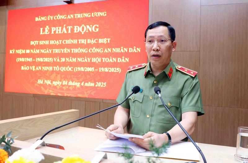 Chiều 4-4, Đảng uỷ Công an Trung ương tổ chức Lễ phát động đợt sinh hoạt chính trị đặc biệt kỷ niệm 80 năm Ngày truyền thống Công an nhân dân (19-8-1945 – 19-8-2025) và 20 năm Ngày hội Toàn dân bảo vệ an ninh Tổ quốc (19-8-2005 – 19-8-2025). Đại tướng Lương Tam Quang, Ủy viên Bộ Chính trị, Bí thư Đảng ủy Công an Trung ương, Bộ trưởng Bộ Công an chủ trì buổi lễ.