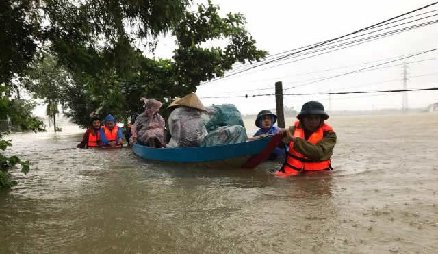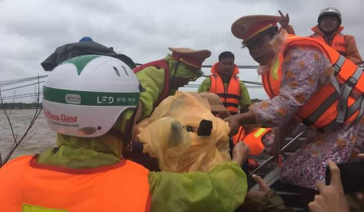 CA tỉnh Quảng Nam dầm mưa đưa người dân vùng ngập lụt đến nơi an toàn. |