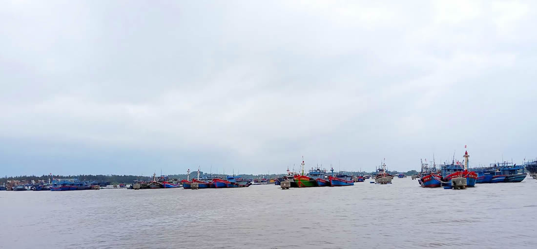 Hàng trăm tàu thuyền đang neo đậu an toàn tại âu thuyên xã Tam Quang, Núi Thành để tránh bão. |