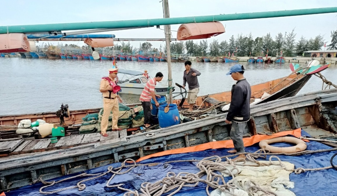 Lực lượng Cảnh sát đường thủy CA tỉnh Quảng Nam giúp dân neo đậu tàu thuyển. |