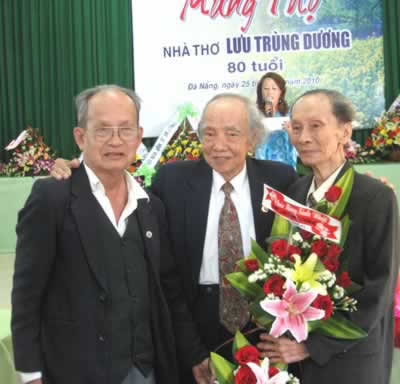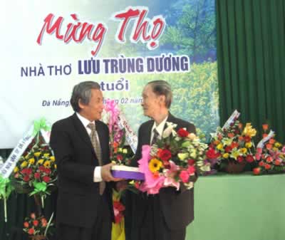 (Cadn.com.vn) - Nhà thơ Lưu Trùng Dương – người có nhiều cống hiến xuất sắc cho nền văn học cách mạng Việt Nam trong hai cuộc kháng chiến và trong thời kỳ xây dựng, phát triển đất nước sau năm 1975 – nay đã bước vào tuổi 80. Ngày 25-2, trong dịp chào mừng Ngày Thơ Việt Nam, Liên hiệp các Hội Văn học-Nghệ thuật TP Đà Nẵng đã tổ chức Lễ mừng thọ một người “anh lớn” trong làng thơ Đà Nẵng và cả nước.