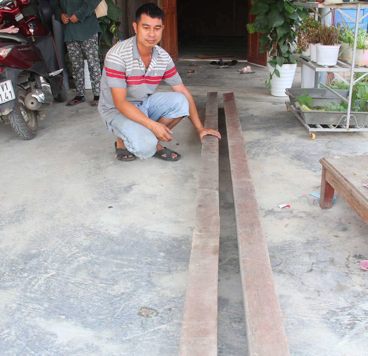 Theo trình bày của anh Thông, khoảng tháng 8-2020, anh được thuê chở gỗ thanh lý trong Hạt Kiểm lâm huyện Bắc Trà My cho một người dân. Cùng đi với anh còn có hai người phụ bốc xếp gỗ lên xe lôi. Sau khi bốc và chở xong số gỗ bán thanh lý trên, kiểm lâm viên tên Cường phát hiện còn dư 2 thanh gỗ (gỗ chuồn, dài hơn 3 mét, ngang khoảng 20cm) nên hỏi tôi có mua không. Tôi hỏi giá bao nhiêu thì anh Cường nói 1 triệu đồng. Tôi thấy giá đó cao nên trả 500 ngàn đồng. Anh Cường đồng ý bán nên tôi lấy. Nghĩ mua gỗ của Hạt kiểm lâm nên tôi yên tâm chở 2 thanh gỗ về nhà với ý định sửa nhà bếp”, anh Thông kể lại.