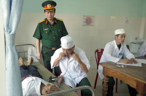 Đại tá Nguyễn Hữu Bình và bác sĩ Bệnh viện quân y 17 khám bệnh cho nhân dân Nông Sơn.