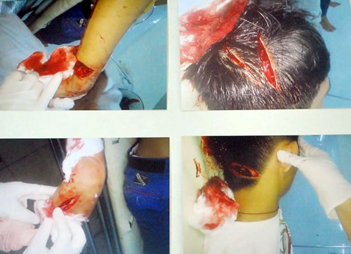 Các vết thương trên người Vỹ (ảnh trên) và hung khí liên quan đến vụ việc được tạm giữ. |