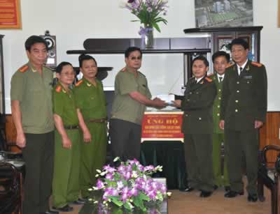 Đại tá Lê Văn Cách trao tiền ủng hộ |