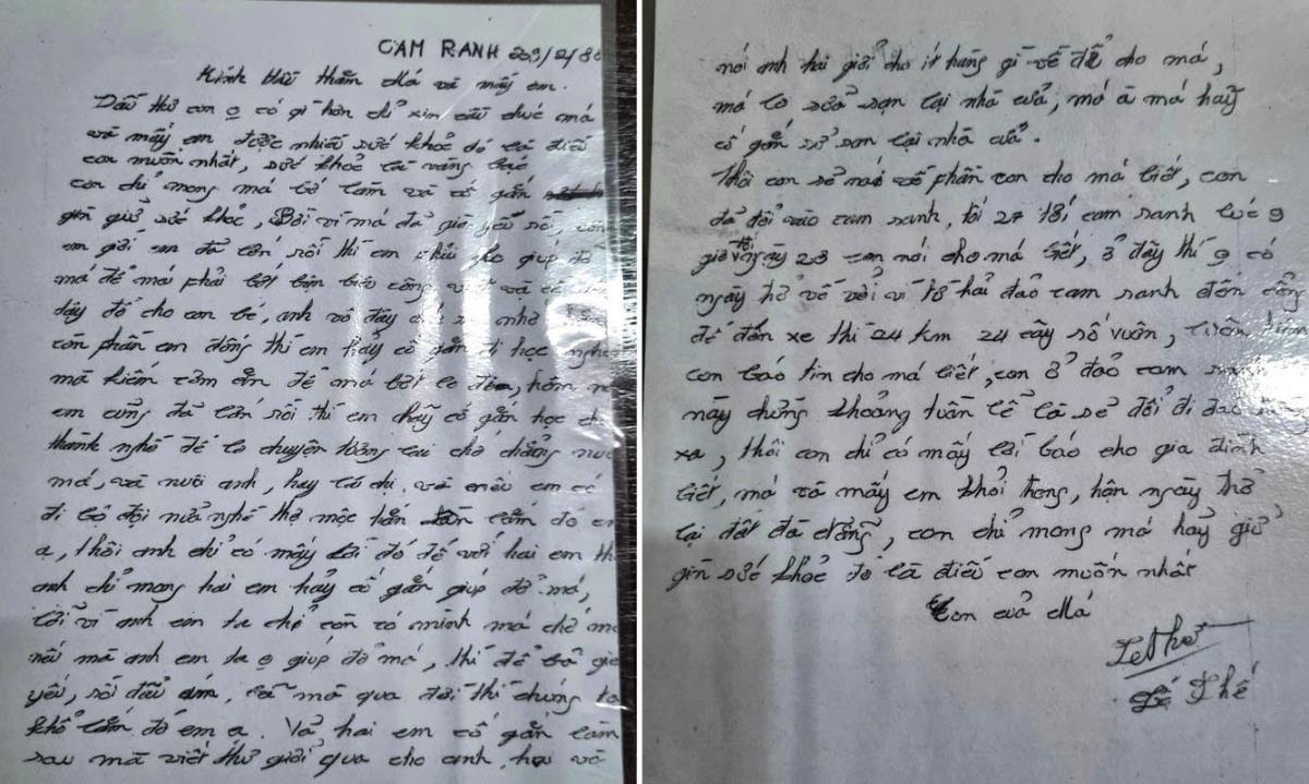 Bức thư cuối cùng của liệt sĩ Lê Thế gửi cho mẹ được mẹ Huệ chụp lại trước khi tặng bản gốc cho Khu tưởng niệm chiến sĩ Gạc Ma ở Khánh Hòa.