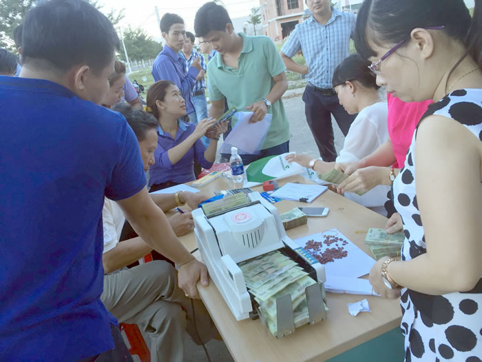 Khách nộp tiền cọc ngay tại buổi tổ chức mở bán. |