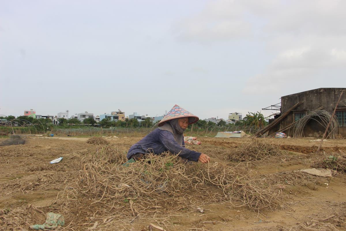 Tại vườn rau La Hường (phường Cẩm Lệ), người dân cũng đang hối hả dọn dẹp giàn leo, rau quả bị hư hỏng để trồng lại. Nhổ bỏ luống rau lang bị thối hư hỏng, bà Trần Thị Thu Hương (60 tuổi) cho biết, dù vườn rau nằm bên sông Cẩm Lệ nhưng vì khu đất trên cao nước ít dâng lên nên nhiều người dân vẫn canh tác bán quanh năm. Đợt mưa lớn kéo dài vừa qua, nước dâng cao gần 2m khiến người dân trồng rau ở đây bị hư hỏng hoàn toàn. Phân bón, vật dụng trồng trọt bị dòng nước cuốn trôi, giàn leo sắt trồng cây bị xiêu vẹo, hư hỏng đành phải bán phế liệu. Vụ này vợ chồng bà Hương trồng các loại rau trên diện tích 10 sào đất sắp đến kỳ thu hoạch. Cơn lũ gây thiệt hại cho gia đình bà hơn 100 triệu đồng.