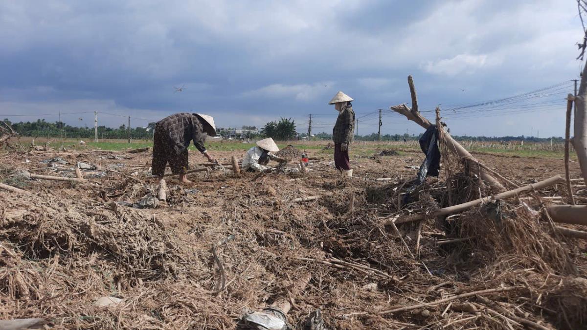 Cách con đường bê-tông, bà Huỳnh Thị Chín (75 tuổi) cùng 2 người em gái đang dọn dẹp đất để trồng lại rau quả bán. Vụ này gia đình bà Chín trồng 2 sào đu đủ, 3 sào mướp đắng, đậu đũa, đậu bắp; đầu tư giống, phân bón, bạt che, giàn leo hết hơn 15 triệu đồng. Nhưng do bị ngập nước lâu, các loại cây trồng đã bị hư hỏng hết. Bà Chín chỉ mới thu hoạch được gần 5 triệu đồng, chưa tính công sức thì lỗ vốn hơn 10 triệu đồng. “Tôi trồng rau quả ở đây đã mấy chục năm nay, chưa thấy trận lũ lớn như vậy. Nước sông dâng cao, ngâm mấy ngày khiến cây trồng hư hỏng hết. Cuộc sống gia đình tôi phụ thuộc vào mảnh vườn này, dù bị thiệt hại nhưng vẫn phải trồng lại. Mong sao không có lũ lụt để canh tác thuận lợi, có tiền trang trải cuộc sống”- bà Chín tâm sự.