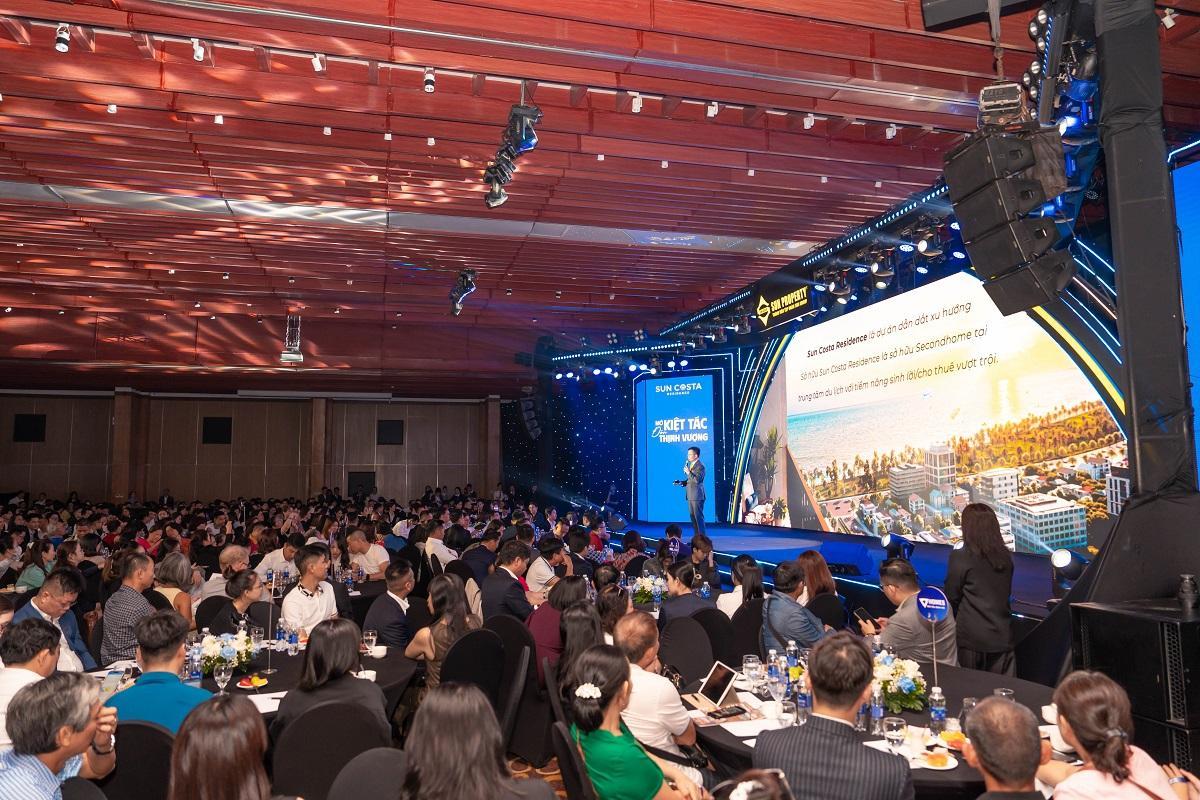 Hơi thở biển Mỹ Khê dường như lan tỏa khắp không gian, nổi bật chính giữa khán phòng là hai tòa tháp biểu tượng của Sun Costa Residence, tựa như những ngọn hải đăng kiêu hãnh vươn cao bên bờ biển.