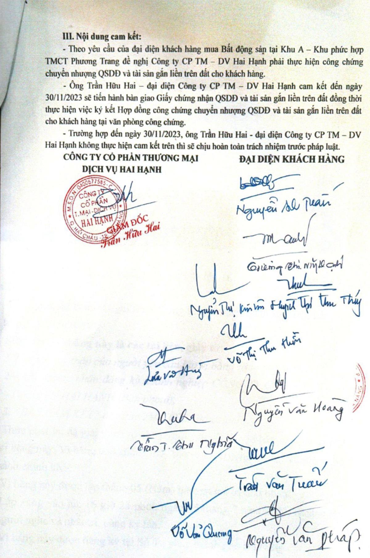 Về phần chủ đầu tư Công ty Phương Trang, vào ngày 18-9-2025, đã có văn bản số 71/2025/CV-FUTALand gửi Công ty Hai Hạnh, nêu rõ: Để thực hiện việc đăng ký, cấp sổ đỏ cho khách hàng đã mua BĐS tại Khu A, Công ty Hai Hạnh khẩn trương hoàn tất nghĩa vụ thanh toán và bồi thường thiệt hại do chậm trễ thanh toán (nếu có) theo các thỏa thuận hợp tác đã được ký kết giữa hai bên; đồng thời nhanh chóng ký kết hợp đồng mua bán BĐS để có cơ sở pháp lý tiến hành đăng ký, cấp sổ đỏ cho khách hàng. Trường hợp tiếp tục trì hoãn, Công ty Hai Hạnh phải chịu hoàn toàn trách nhiệm trước khách hàng và trước pháp luật nếu phát sinh khiếu nại, khiếu kiện…